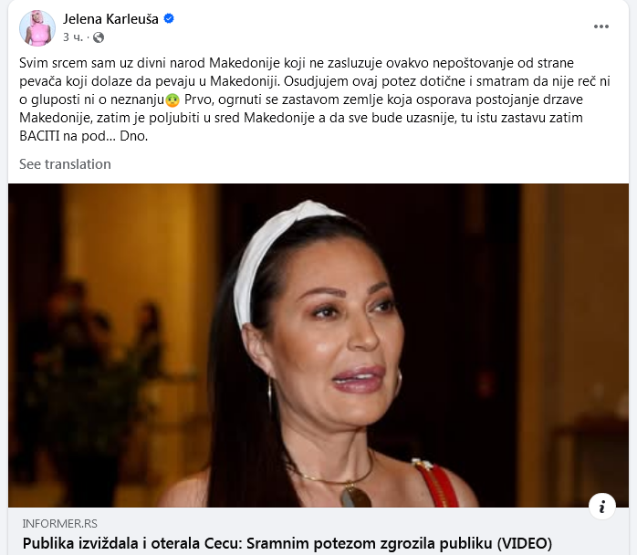 По ова, Јелена Карлеуша се огласи на социјалните мрежи со остра реакција и отворена поддршка за македонскиот народ.