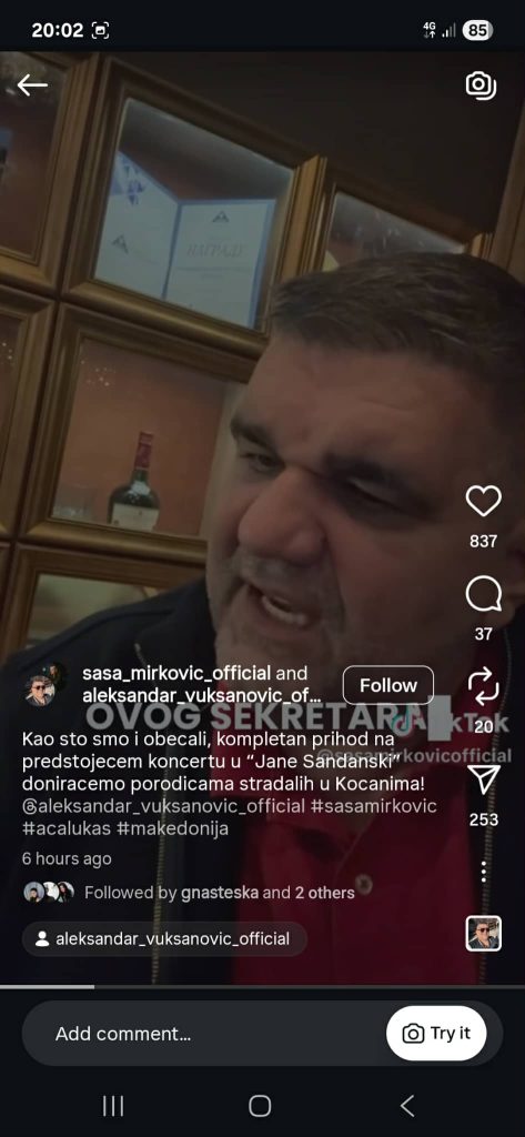 Ситуацијата денес доби нов пресврт. Саша Мирковиќ на својот Инстаграм профил објави видео во кое заедно со Аца Лукас соопштува дека концертот сепак ќе се одржи, а уште позначајно – целиот приход од настанот ќе биде дониран за семејствата настрадани во трагедијата во Кочани.